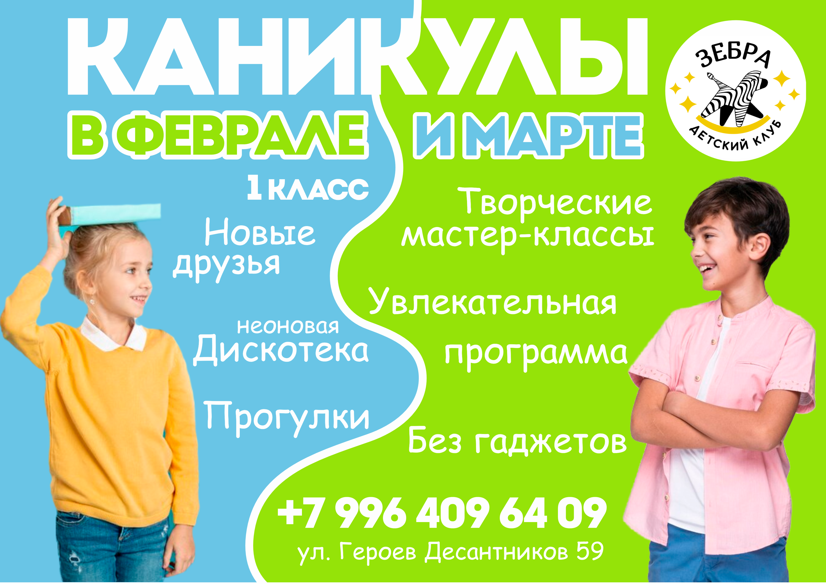 Мы приглашаем весело и интересно провести каникулы в клубе дневного пребывания «Зебра»! Активный отдых, вкусное питание, новые знакомства, полезные знания, просмотр мультфильмов, дискотеки, игры, развлечения и море позитивных эмоций – все это ждет Ваших детей в нашем клубе. Возраст детей от 6 до 12 лет.